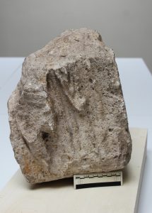 Het tweede stuk dat hier wordt besproken is van een zwaar gehavend kalkstenen reliëf. We zien volgens dr. Veen een mannelijke figuur met gespierde benen en een breed lichaam. Zijn hoofd, een stuk van het bovenlijf, de rechterarm en een deel van het linkerbeen zijn verdwenen. Van het zwaar gehavende bewaarde deel van het lichaam is het oppervlak flink beschadigd. Zo is niet te zien of de man volledig naakt is, of een kledingstuk om de lendenstreek heeft gewikkeld. In zijn linkerhand heeft hij een object dat smal van onderen is en naar boven breder uitloopt en tegen zijn linkerarm en -schouder ligt.